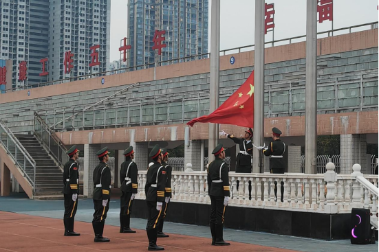 伴随着激昂的《义勇军进行曲》,五星红旗冉冉升起,全体师生庄严肃立,行注目礼,高唱国歌,嘹亮的歌声在校园上空回荡,传递着对祖国的热爱与敬意。
