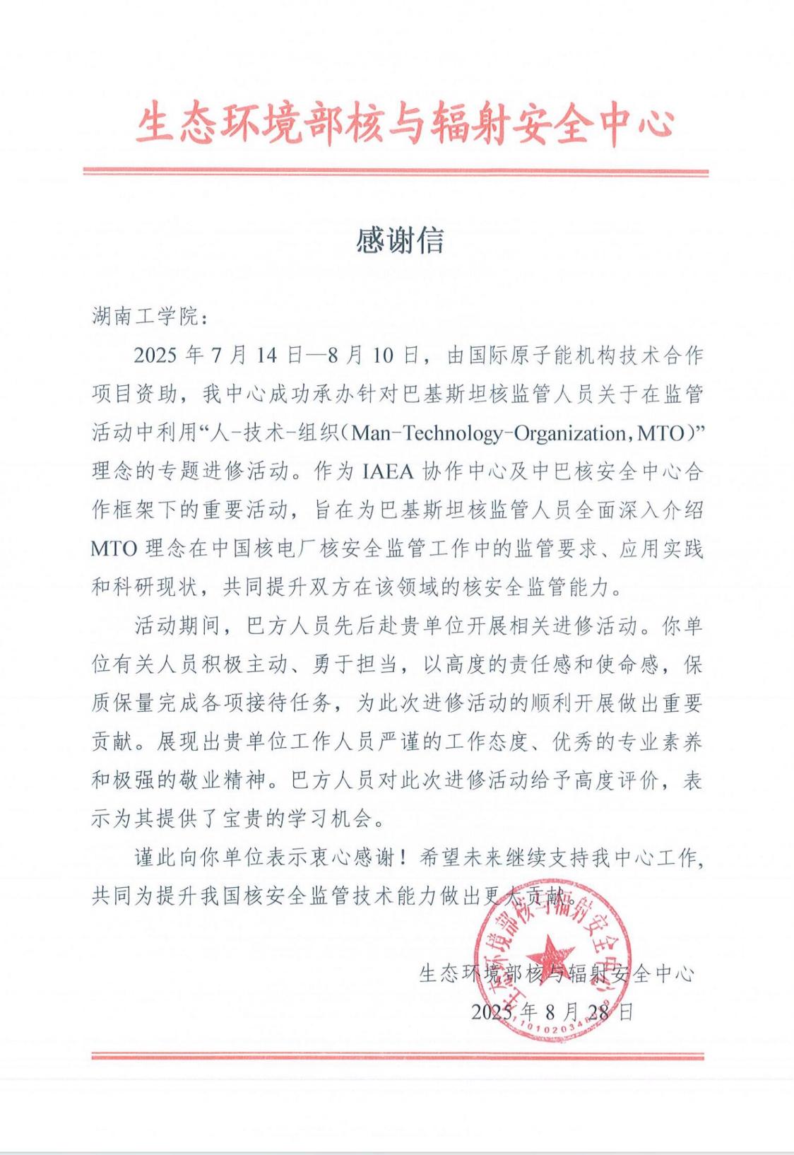 近日,生态环境部核与辐射安全中心向best365官网发来感谢信,对best365官网承接针对国际原子能机构(IAEA)技术合作项目资助学员的培训表示感谢,并对best365官网工作人员严谨的工作态度、优秀的专业素养给予高度肯定。接受培训的巴基斯坦核监管工作人员对在best365官网的进修活动高度评价,表示为其提供了宝贵的学习机会。