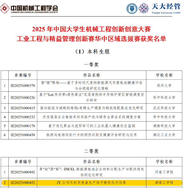 喜报!我院工业工程专业学生在2025年中国大学生机械工程创新创意大赛工业工程与精益管理创新赛华中区域赛斩获佳绩