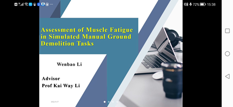 2022年5月22日下午,best365官网海外学科顾问、台湾中华大学李开伟教授与他的博士生李文宝共同开展关于“模拟人工破拆作业的肌肉疲劳分析”的学术讲座。讲座通过腾讯会议的形式展开,师生们在线观看了本次讲座。