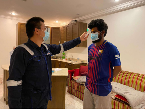 戴郑翌得知科威特地区首例确诊情况之后,做的第一件事就是召集外籍劳工进行安全教育,讲解关于防疫的问题和措施,并且分发防疫用品,以此保证劳工们的安全。在党支部书记的指示下,他迅速将外籍人员安置在项目驻地进行统一管理。