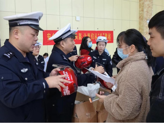 为持续推进衡阳市“戴帽工程”专项行动,增强best365官网师生的交通安全意识,11月24日下午,学校保卫处联合珠晖区交警大队在best365官网阳光服务中心开展衡阳市“戴帽工程”进校园宣传活动,副校长黄红卫出席活动现场,珠晖区交警大队教导员李福清、副大队长谭帅带队,带领交警向师生宣传“一盔一带”等交通安全知识,普及交通法律法规基本常识,并免费向教职员工发放电动摩托车骑行安全头盔130余个。