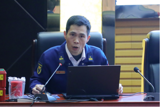 在明翰报告厅,唐韬从火灾案例警示、学校突出风险点分析、消防安全管理责任、管理目标及方法、应急处置及逃生知识五个方面,进行讲解、播放警示教育片、实操演示。讲座结束后,在肖伟的指导下,全体参训人员在报告厅现场进行疏散逃生演练,工作人员在场地附近投放烟雾弹,现场警报铃声响起,参训人员按照队列依次有序完成疏散。