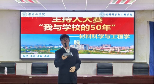 第一环节“我与湖工校庆有约”,参赛选手借助精心制作的 PPT,将校史发展、学科进步与个人成长紧密相连,进行了精彩演讲。有选手从材料学科创业历程出发,分享师生科研攻坚故事,感慨“湖工精神催人奋进”;也有选手以校庆为线索,串联实验室奋斗与校园生活点滴,抒发“与湖工共成长”的深厚情感。现场学生观众在选手的真挚讲述中,一同回顾学校发展历程,进一步增强了爱校荣校的集体意识。