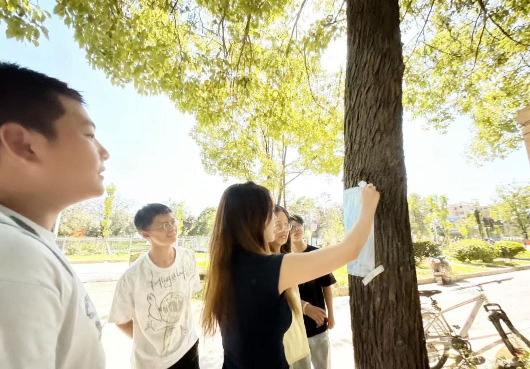 活动设三大环节:其一“抱树拓印”,这是面向存在一般心理困扰学生的心理“抱树疗法”,同学们环抱校园大树,借自然力量疗愈身心,再拓印树皮纹理留存纪念,不少人在拥抱与触摸中放松下来,积攒平静能量。