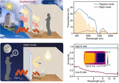 基于两性离子水凝胶的上临界溶液温度(UCST)特性,利用相变水凝胶聚(磺酸甜菜碱-甲基丙烯酸)构筑了一款具有高温透明、低温变白的热致相变水凝胶,并以此为主要部件,结合辐射制冷结构的设计,开发了一种能够白天透明、全天辐射冷却和夜间隐私保护的新概念智能窗。