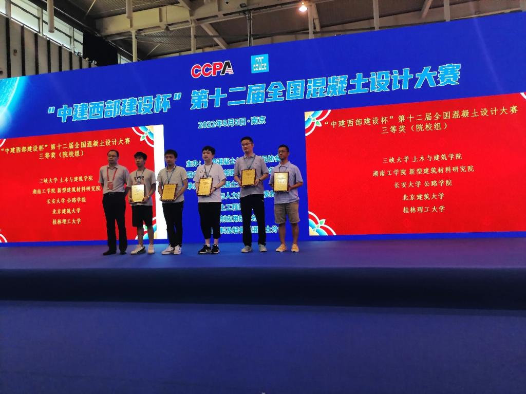 2022年8月5日,“中建西部建设杯”第十二届全国混凝土设计大赛在南京国际博览中心5号馆举行,best365唯一官方网站材料学院学生李江峰、向庭、彭允灏、邹帛宏、田佳组成的新型建筑材料研究院代表队获得了本次比赛三等奖,参加比赛的项目是“轻质高强混泥土配合比设计”,指导老师分别是曾利群、袁龙华老师。