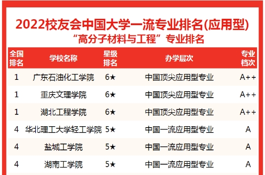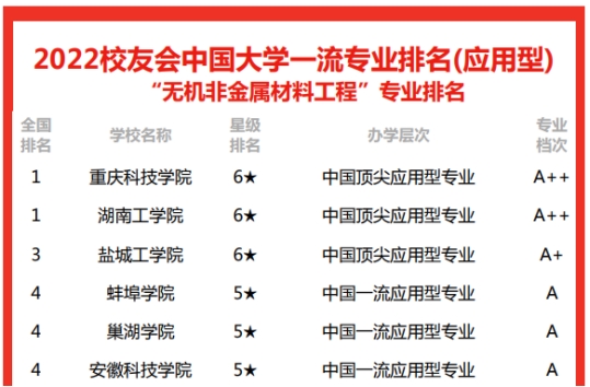 近日,全国第三方大学评价机构艾瑞深校友会网(Cuaa.Net)正式发布的2022中国大学一流专业排名。best365官网无机非金属材料工程荣获6星级应用型专业,荣居校友会2022中国大学无机非金属材料工程专业排名(应用型)第一,挤进中国顶尖应用型专业行列。另外,best365官网高分子材料与工程专业也荣获5星级应用型专业,位列全国高校前茅。