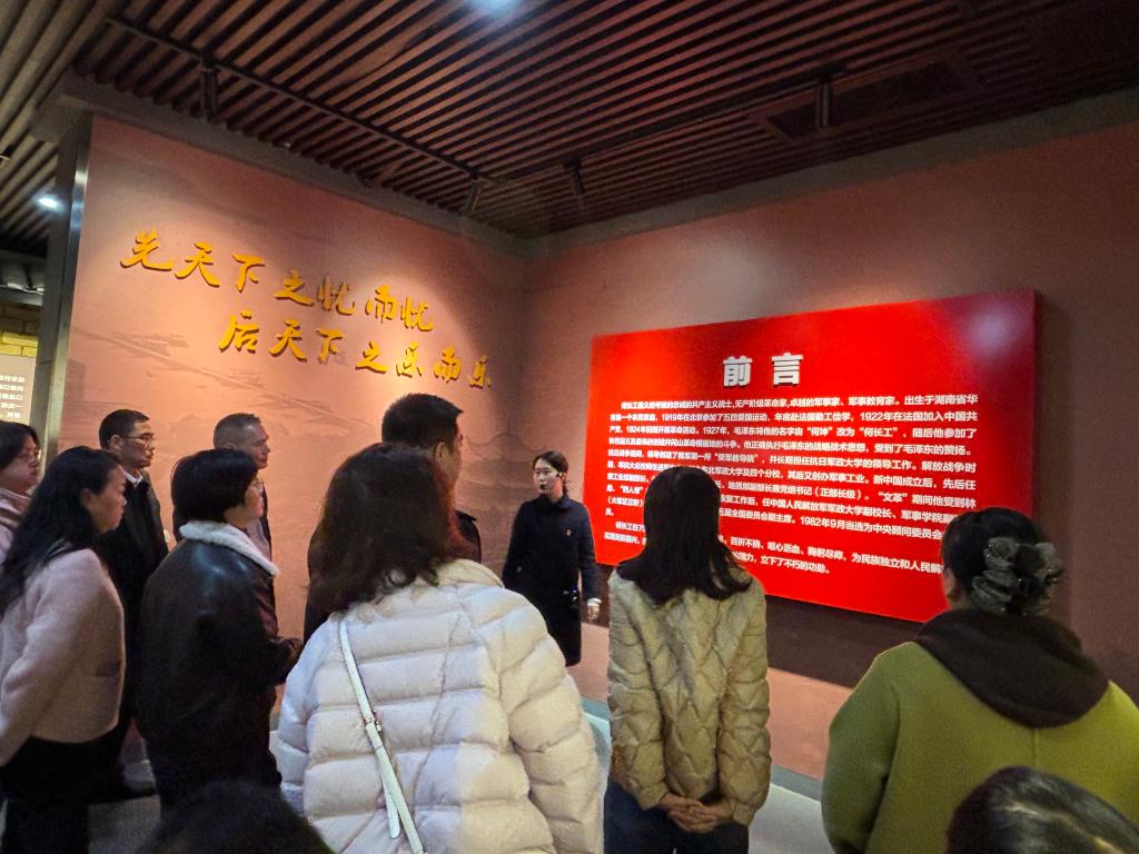 随后,同志们怀着崇敬的心情步入展厅。在讲解员的深情讲述下,何长工同志波澜壮阔的革命生涯清晰再现:从早期投身工人运动,到参与秋收起义、设计制作中国工农革命军第一面军旗、促成井冈山“朱毛会师”,再到新中国成立后为教育事业和地质工作呕心沥血。一幅幅历史照片、一件件珍贵文物,生动展现了这位老一辈革命家对党忠诚、勇挑重担、廉洁奉公的崇高风范。党员们凝神观看,深切体悟何长工同志“功高不自居,位高不自显”的宝贵精神。