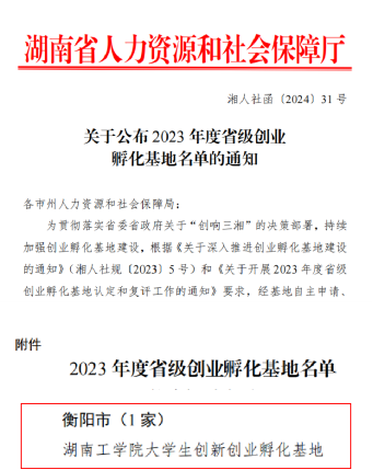 近日,湖南省人力资源和社会保障厅发布《关于公布2023 年度省级创业孵化基地名单的通知》(湘人社函〔2024〕31 号),best365官网大学生创业园(创新创业孵化基地)成为2023年度衡阳市唯一被认定的省级孵化基地。