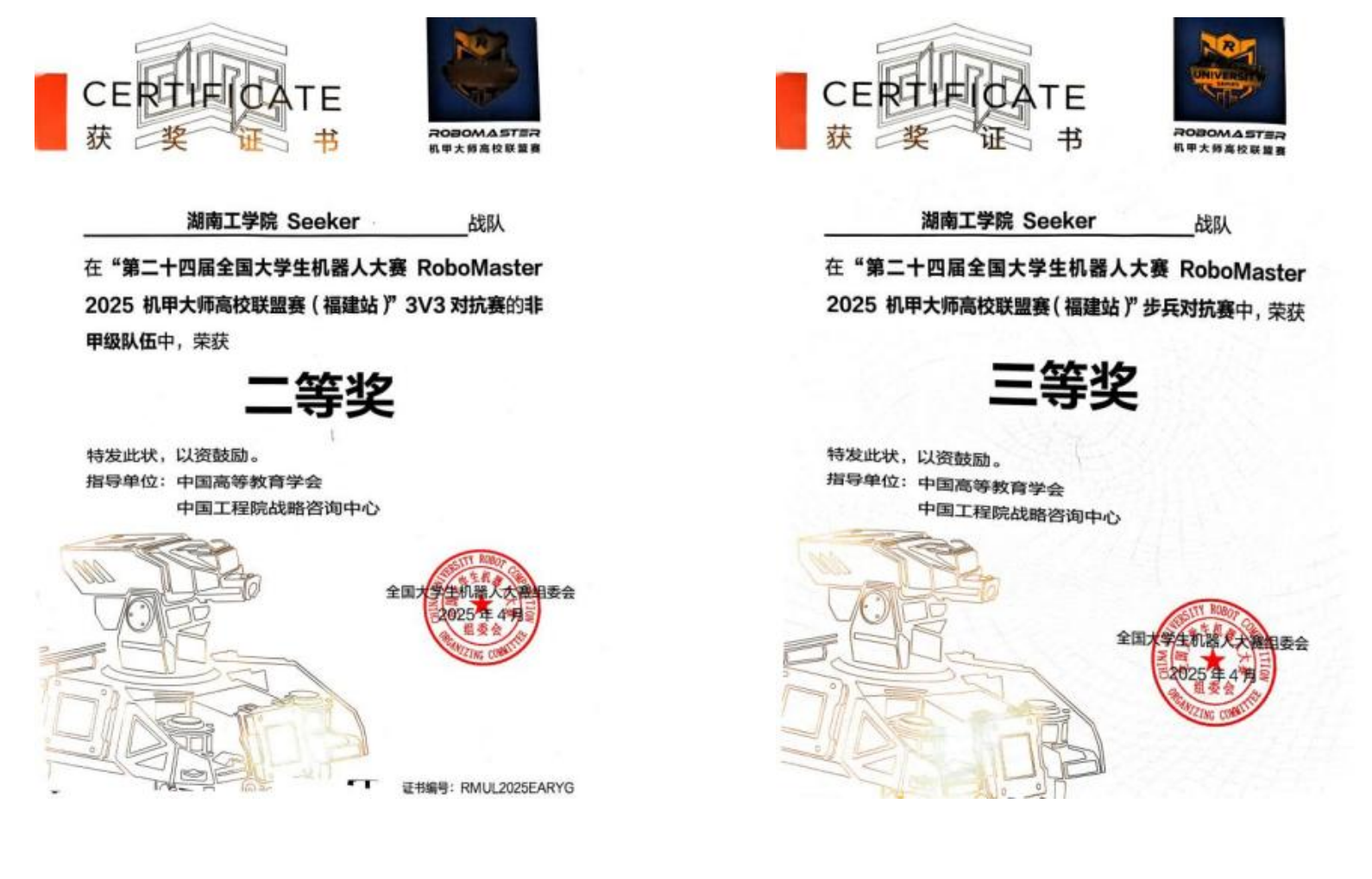 best365唯一官方网站由林泽鑫、孙国庆等14位同学组建的Seeker战队获“机器人3V3对抗赛”二等奖1项、“步兵机器人对抗赛”三等奖1项,团队英雄机器人获得机器人竞技奖二等奖1项,哨兵机器人获得机器人竞技奖二等奖1项,步兵机器人获得机器人竞技奖三等奖1项。