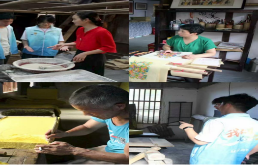 在福美祥(原同福昌)年画作坊,省级非遗传承人尹东香老师向团队系统解读了滩头年画的千年传承史,从“门神驱邪”的民俗起源到“二十四节气”的题材演变,结合亲手演示的拓印、晕染等核心工序,完整呈现了这项技艺的文化基因。材料溯源环节中,团队专程探访本地竹纸作坊,国家级非遗传承人李志军老师现场展示了手工抄纸“荡料入帘”“覆帘压纸”的精妙手法,揭秘了以嫩竹、石灰、杉树皮为原料的天然造纸工艺——这种纤维坚韧、吸水性强的竹纸,正是滩头年画“色彩饱满不褪色”的关键基底。两位传承人在得知团队计划通过创新设计与数字技术推广滩头年税后,均对其跨界思路给予高度认可,认为“年轻一代的介入能让老手艺接上时代地气”。