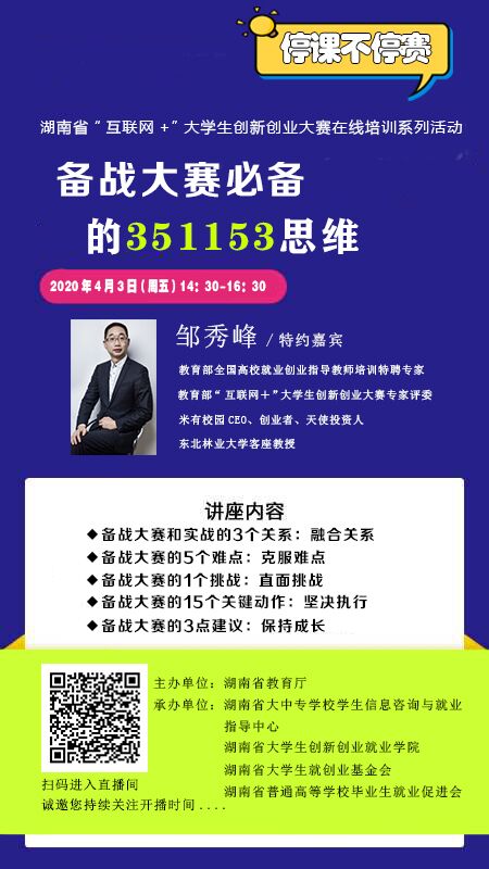 根据湖南省“互联网+”大学生创新创业大赛组委会工作要求,现发布第六次线上培训安排,请各二级学院创新创业大赛组委会成员、指导老师、拟参赛团队、创业孵化项目、省级及以上大学生创新创业项目负责人及指导老师准时观看。