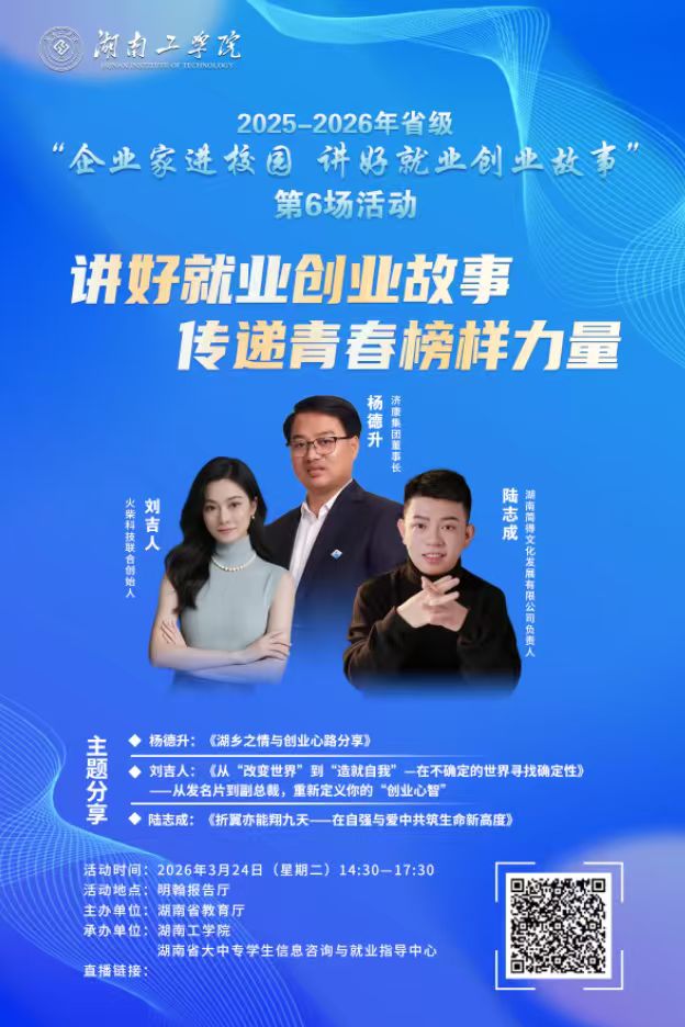 根据湖南省教育厅《关于开展2025—2026年“企业家进校园讲好就业创业故事”活动的通知》要求,best365官网将组织best365唯一官方网站专场活动。现将具体活动组织事宜通知如下: