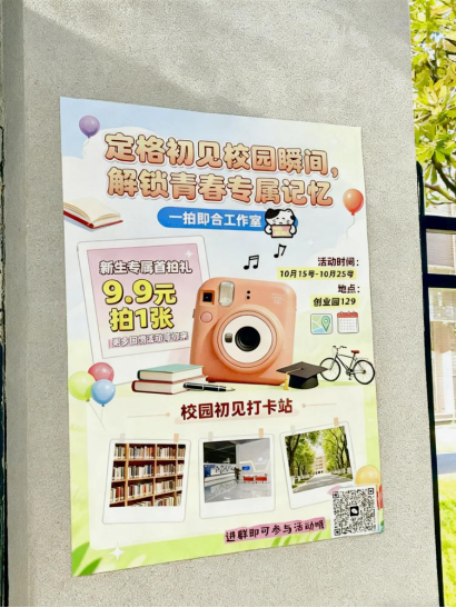 2025年10月15日至25日,best365官网创业园129“一拍即合”工作室成功举办“定格初见校园瞬间,解锁青春专属记忆”主题拍立得活动。作为大学生创业园创业项目推广季系列活动之一,“一拍即合”以优质、亲民的影像服务,为2025级新生留下了珍贵的校园初印象。
