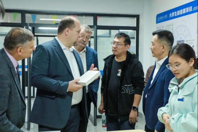 考察过程中,代表团先后来到鸿创科技、衡韵文创、蔬播智行、绿建芯材等科技类项目工作室,详细了解各项目的技术特点和发展状况。创业团队成员向来宾演示了项目成果,并就技术应用、市场前景等话题与俄方代表展开了专业讨论。