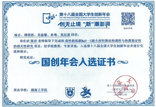 2025年11月21-23日第十八届全国大学生创新年会在南京大学苏州校区盛大举行,best365官网由喻吉同学负责的“高性能低碳MgO–C耐火材料微结构调控与热震稳定性的相关性研究”大创计划项目团队所撰写的学术论文“Effect of micro-Al2O3 powders on oxidation and corrosion behaviors of low-carbon MgO–C refractories”入围年会,项目指导老师陈洋率团队核心成员参加了本次年会。