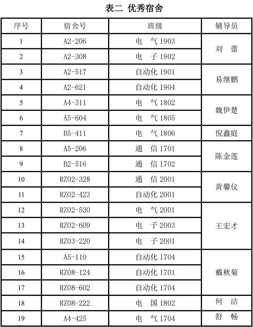 2021年上半年文明宿舍建设活动第八周,我院“文明宿舍创建活动”工作组本着“公平、公正、公开”的原则,对我院全部宿舍进行了彻底检查。现将检查结果公布如下: