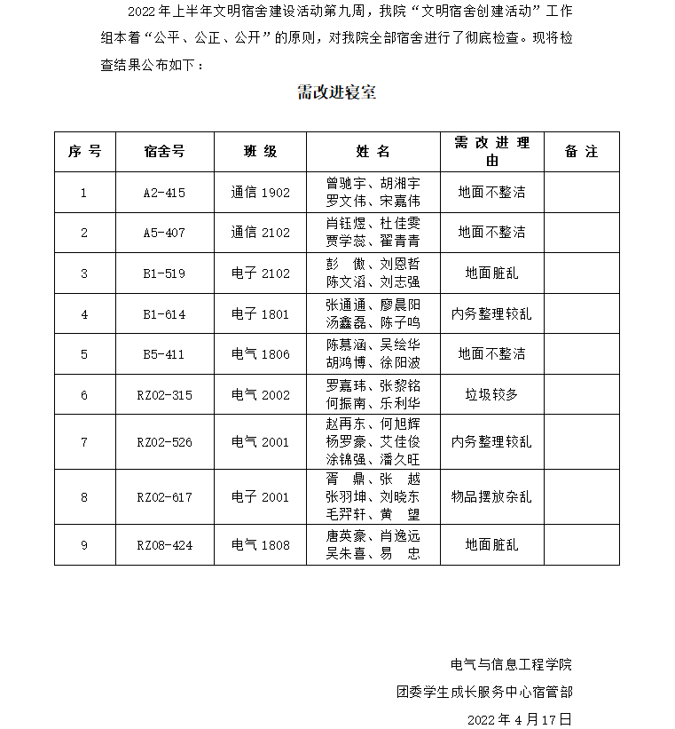 2022年上半年文明宿舍建设活动第九周需改进宿舍