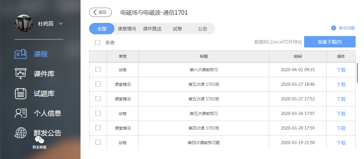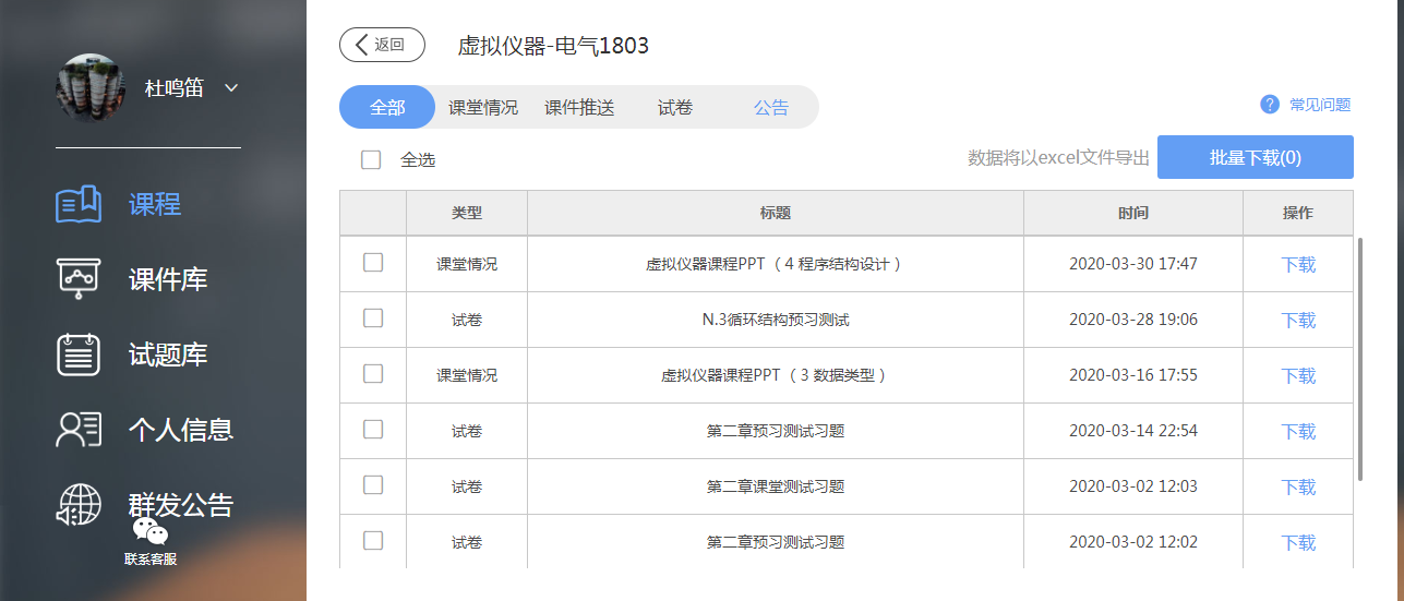 2、《电磁场与电磁波》课程根据线上教学要求备课,整理好课程教学PPT、练习题、电子教材、推荐参考文献等教学资料。《虚拟仪器》课程在教学设计上,通过小而精的项目模块、线上测试,提高了实践技能学习效果、及时获得了学习成效反馈。做到“一课一策”,最大程度地保证了在线的教学质量。