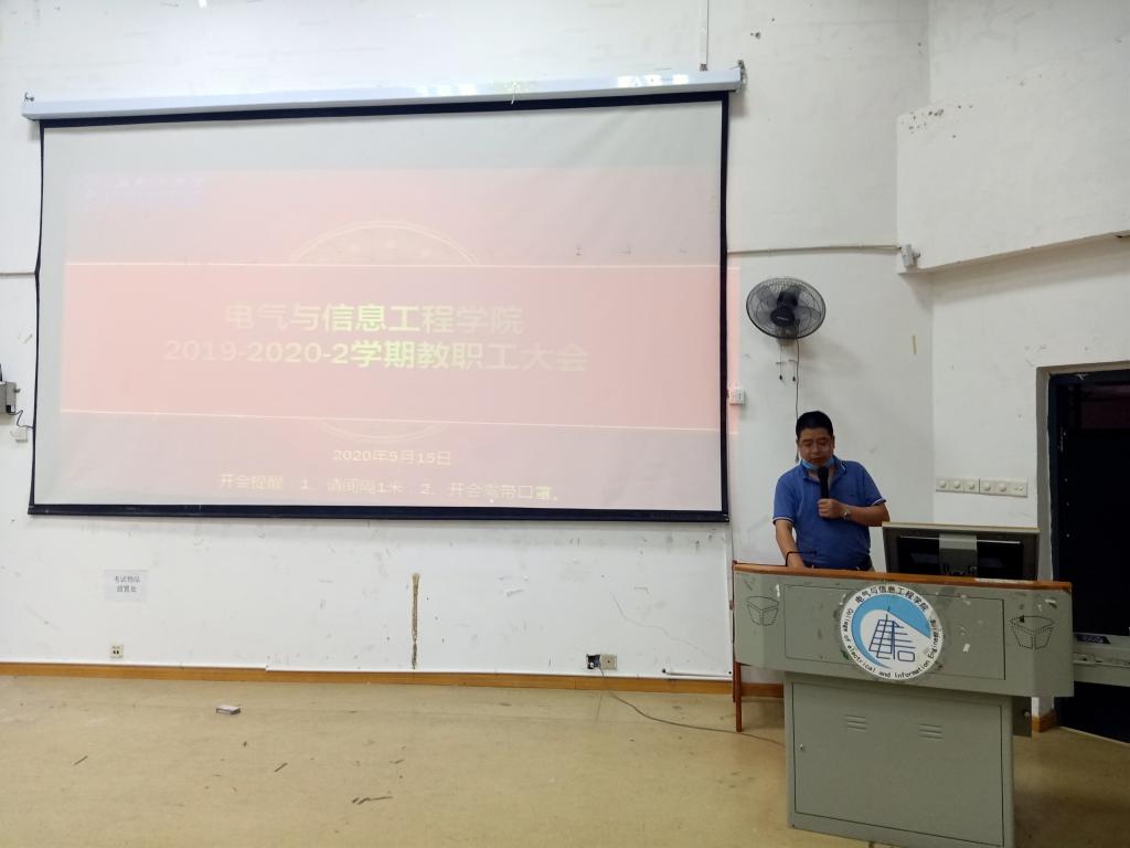 2020年5月15日,电气与信息工程学院在3209召开2019-2020-2学期期初全体教职工大会。参会人员有学院班子成员及电信学院全体教职工。会议由党委书记范志明主持。