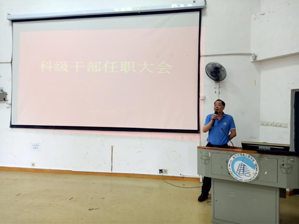 7月3日,电气与信息工程学院在3209召开2019-2020-2学期期末教职工大会暨新任科级干部任职大会。参会人员有全院领导班子成员、新提任科级干部(刘永晟、阳柯、黄馨仪)等三位同志及其原单位领导、电气与信息工程学院全体教职工。会议由党委书记范志明主持。