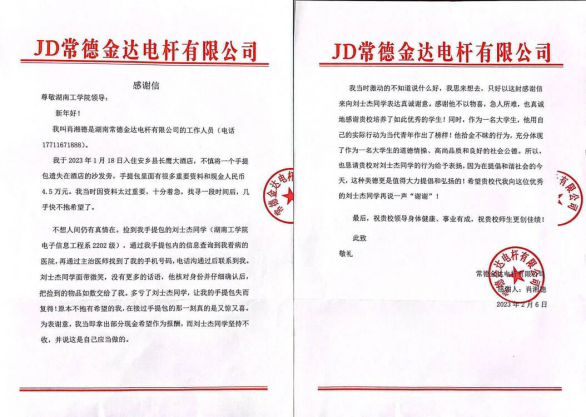 2023年1月18日,电气与信息工程学院电子2202班刘士杰同学在安乡县金德大酒店捡到一个手提包,内有4.5万元现金和重要资料。他第一时间想方设法找寻失主,并将手提包及包内物品悉数归还。此次事件中,刘士杰同学拾金不昧的实际行动体现了大学生的高尚品德和良好的精神风貌。特此对刘士杰同学提出表扬。
