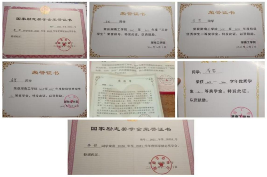 在校期间,曾获得国家励志奖学金、校级一等奖学金两次、校级三等奖学金、校级三好学生、校级优秀团干、校级优秀团员等;在课外生活中,曾多次参加社团活动及比赛,获得“圆融杯”电子设计竞赛校级三等奖、机械创新设计大赛校级三等奖。并在新生才艺大赛上获得最佳团体奖、最佳组织奖。