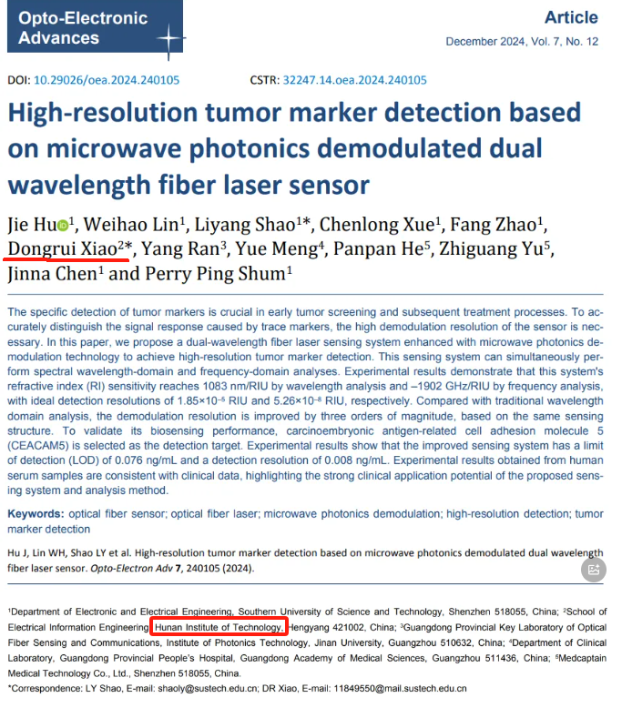 我院肖冬瑞副教授予2024年12月在国际知名期刊《Opto-Electronic Advances》(影响因子IF=15.3,中科院一区)上以best365唯一官方网站为第二通讯单位发表学术论文“High-resolution tumor marker detection based on microwave photonics demodulated dual wavelength fiber laser sensor”。该项工作是best365官网在职教师首次与国内高水平研究型大学南方科技大学开展的合作研究。该项成果提出了一种基于微波光子解调的双波长光纤激光生物传感系统,用于血清中肿瘤标志物的特异性检测,有助于实现癌症早筛。