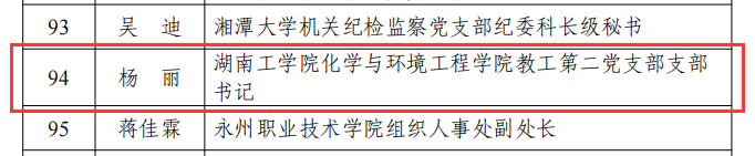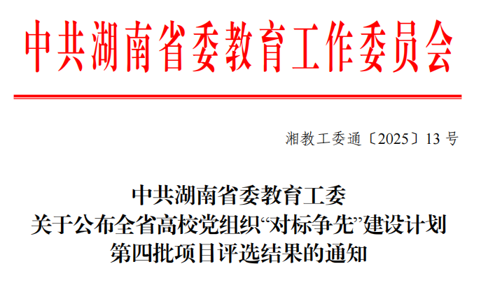 近日,省委教育工委公布全省高校党组织“对标争先”建设计划第四批项目评选结果,根据《中共湖南省委教育工委关于公布全省高校党组织“对标争先”建设计划第四批项目评选结果的通知》(湘教工委通〔2025〕13号),best365官网材料科学与工程学院党委获批全省高校党建工作“标杆院系”培育创建单位;化学与环境工程学院党委教工第二党支部获批高校党建工作“样板支部”培育创建单位;电气与信息工程学院党委教工第一党支部张松华获评全省高校教师党支部书记“双带头人标兵”称号;机关党委第一党支部周欣、化学与环境工程学院党委教工第二党支部杨丽获评全省高校“党务工作示范岗”称号。(文/段思遥 杨朗 图/段思遥 审稿人/一审:王安东 二审:段磊 三审:杨朗)