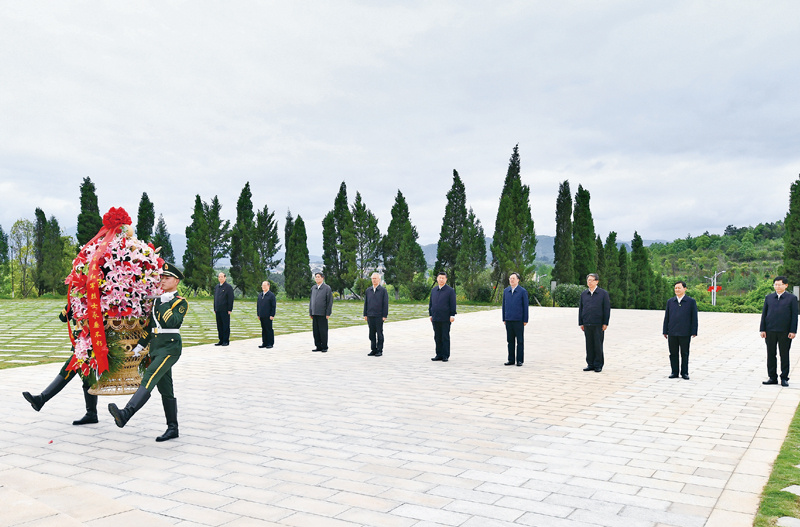 2021年4月25日至27日,中共中央总书记、国家主席、中央军委主席习近平在广西考察。这是25日上午,习近平在位于桂林市全州县的红军长征湘江战役纪念园,向湘江战役红军烈士敬献花篮。 新华社记者 谢环驰/摄