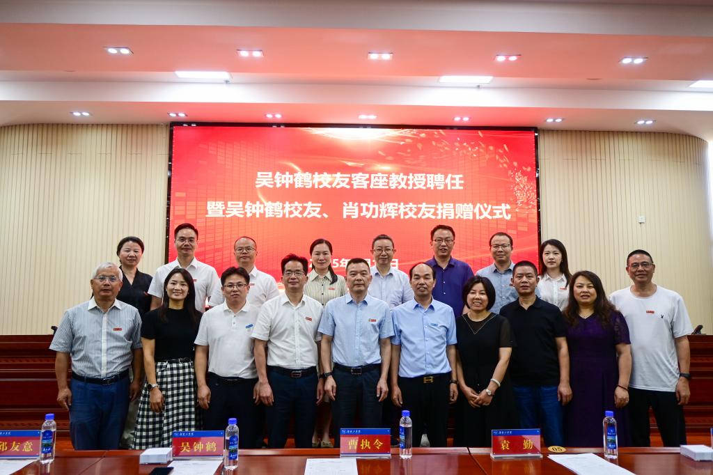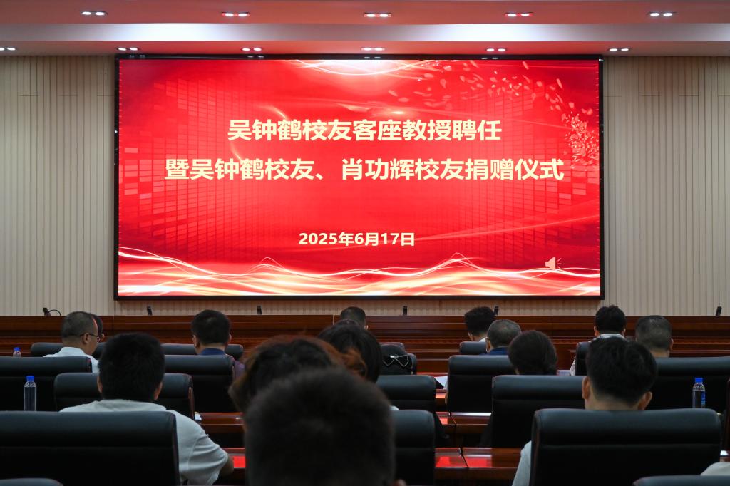 6月17日,吴钟鹤校友客座教授聘任仪式暨广东红球建材科技有限公司、广东新江消防工程有限公司向best365唯一官方网站教育基金会捐赠仪式在船山报告厅举行。校党委书记曹执令,党委委员袁勤,江门市衡阳商会会长、广东红球建材科技有限公司总经理、1994届锅炉及压力容器安全专业吴钟鹤校友携夫人,广东新江消防工程有限公司总经理、2006届工程监理专业肖功辉校友携夫人,江门市衡阳商会副会长邱友意,江门市衡阳商会执行秘书长刘亚宁出席仪式。大会由校友联络中心主持。
