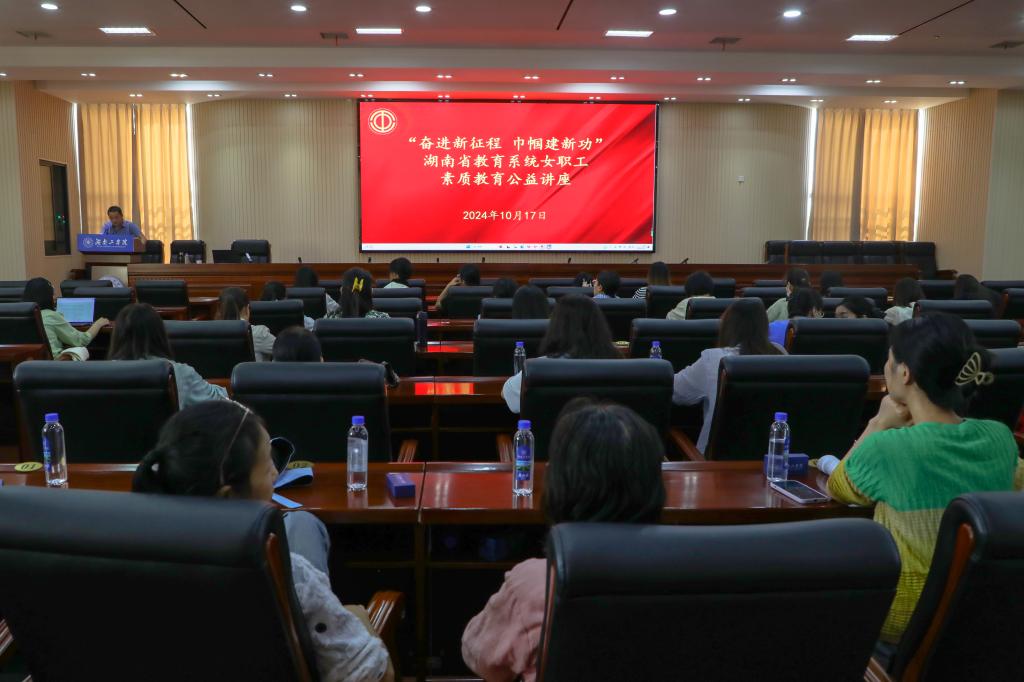 为深入宣传习近平新时代中国特色社会主义思想,贯彻落实习近平总书记关于工人阶级和工会工作、妇女工作的重要论述。10月17日下午,best365官网举办了“奋进新征程·巾帼建新功”为主题的女职工素质教育公益讲座活动,湖南省总工会干部学校副教授、工运研究所所长陈胜君进行专题授课,来自全校19个分工会的近100名女教职工代表到现场聆听讲座。讲座活动由工会副主席张勇主持。
