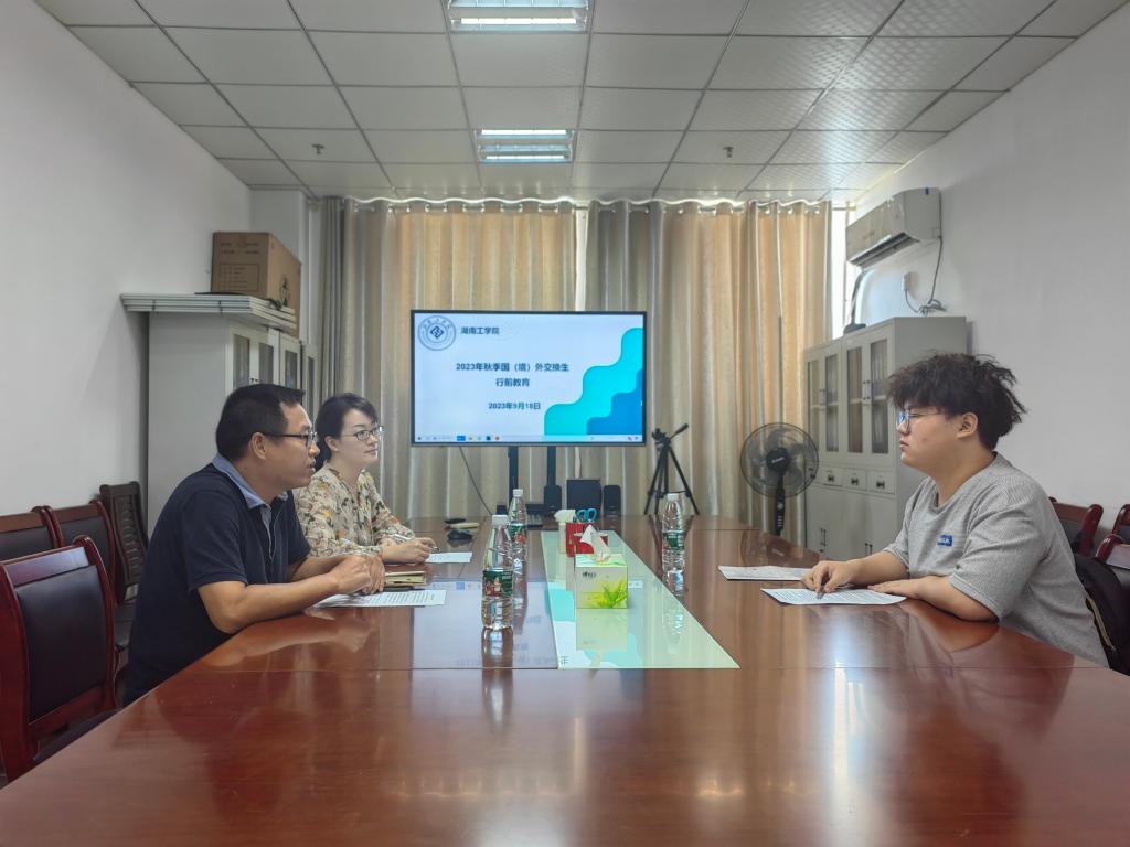 2023年9月18日上午,2023年秋季国(境)外交换生行前教育会在教学大楼1018召开,国际合作交流处副院长彭艳、保卫处科长黄勇参加了此次会议。