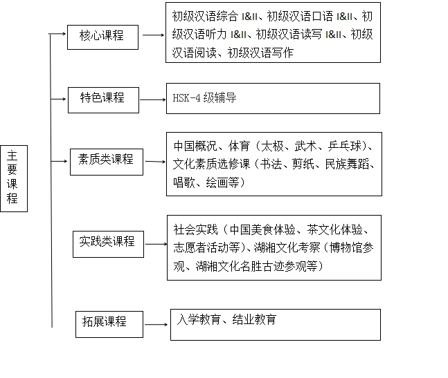 《中国概况》(H)、《文化素质选修课》(H)、《社会实践》(L)、《湖湘文化考察》(L) |
