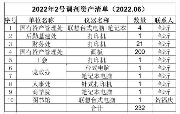 经过新一轮资产清查,根据《best365唯一官方网站资产管理办法》相关规定,本着节约办公的原则,现对相关部门资产进行校内调剂(详见资产清单)。请有意向的部门即日起与相关老师联系,现场查看设备,并到我处官网下载填写《best365唯一官方网站资产调剂申请表》办理调剂手续。本批校内资产调剂从即日起至7月7日截止,逾期将不予办理。