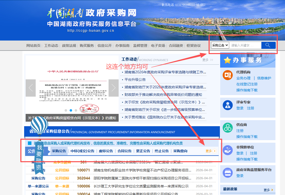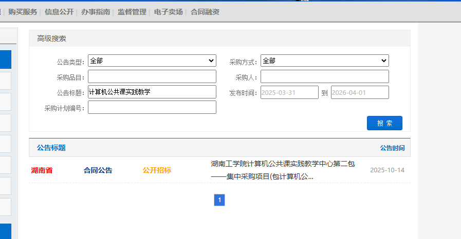 湖南政府采购网查询方式:官网->右上角搜索或中部“更多”->项目名称、大概时间段(建议查询时间段在一年以内),例如查询采购项目名称为“计算机公共实践教学中心”的项目,在公告标题中输入“计算机公共实践教学”字样,大概时间为2025年3月31日-2026年4月1日,查询过程如下: