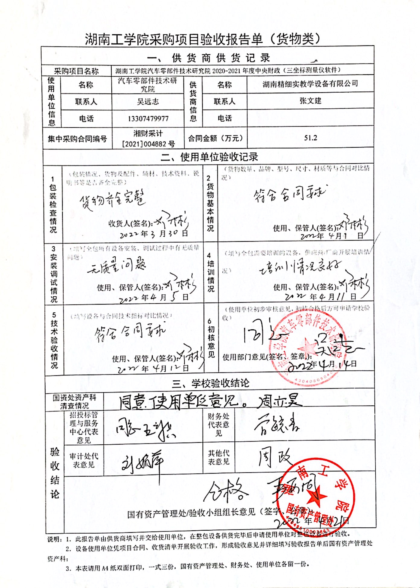 根据国有资产管理处对采购项目的验收安排,2022年4月21日国有资产管理处组织招投标管理与服务中心、审计处、财务处、学科建设与发展规划处、各使用部门以及供货商代表参加汽车零部件技术研究院2020-2021年度中央财政(三坐标测量仪软件)进行现场验收。