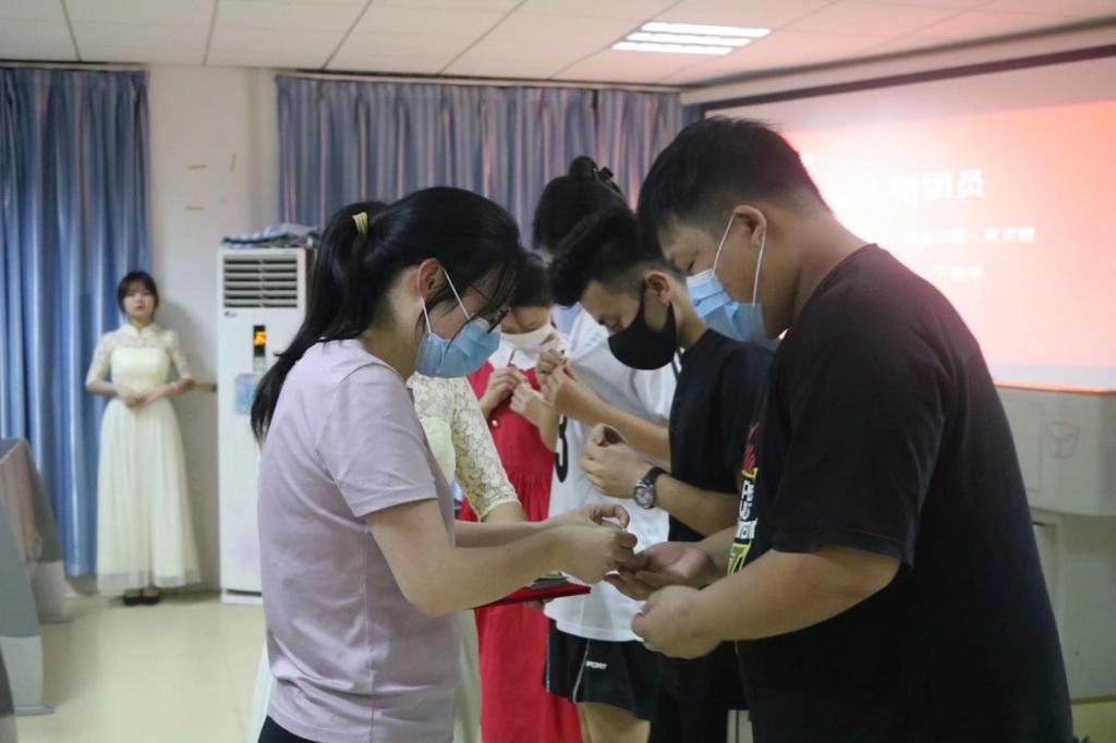 在颁奖环节前,我们播放了一段本学年团活动视频,视频记录了我院老师与同学在不同团学活动的身影,呈现了在过去时光中取得的不俗成绩,学院领导及老师分别对工作中涌现出的优秀集体和先进个人进行表彰颁奖。学生代表上台发言,他表示作为新时代的大学生,应与学校和祖国的发展同频共振,将自己个人的前途同学校、地方以及社会的发展紧密结合,在学校“强旅报国”和实现中华民族伟大复兴“中国梦”的征程中贡献青春力量。陈凌霄为新团员颁发团员证并佩戴团徽,全体成员共同重温了入团宣誓,通过信仰及实际行动继承和发扬共青团员精神。