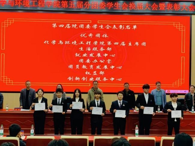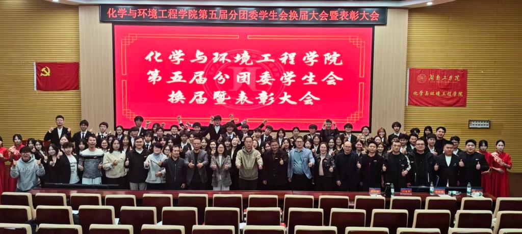 致敬耕耘,奔赴新程。11月17日晚,化学与环境工程学院第五届分团委学生会换届暨表彰大会在明翰报告厅隆重举行。学院党委书记李来丙、院长娄晓明、党委副书记蔡玲、副院长刘宁、学工办主任兼分团委书记陈凌霄、实验中心主任杨丽、教科办主任王津津、组织委员谭斌、各教研室主任及全体辅导员莅临本次大会,校团委学生会主席团、各二级学院主席团与化环学院团学会全体成员共同见证本次盛会。