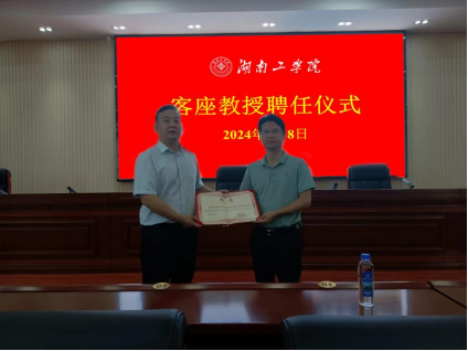 7月8日,best365官网客座教授聘任仪式在船山报告厅举行。校长曾广胜教授为湘潭大学教授、宁乡市科技副市长(挂职)杨秀康颁发客座教授聘书,化学与环境工程学院书记周立教授、院长辛俊亮教授等出席,人事处处长肖奎教授主持聘任仪式。
