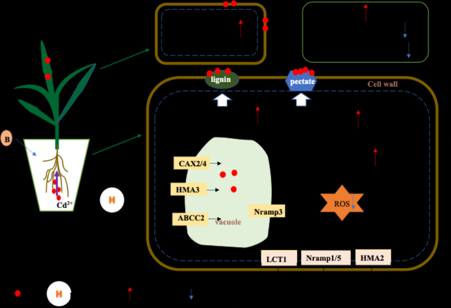 镉污染和硼匮乏是我国南方农田面临的严峻土壤环境问题。近年来的研究表明,外源性施用硼等营养素可以有效降低作物中的镉含量,从而确保食品安全。硼主要通过以下几种机制增强作物对镉的耐受性,并减少其吸收与积累:(1)增强抗氧化酶活性,减轻镉引起的氧化损伤,维持细胞膜的完整性和功能;(2)调节质膜和液泡膜中转运蛋白的表达,减少镉的吸收与积累;(3)通过调节细胞壁多糖的合成和修饰,促进镉在细胞壁的螯合,减轻镉毒性并限制其从根向茎叶的转移;(4)通过调节ABA和BRs等植物激素间接降低作物对镉的吸收与积累(图1)。