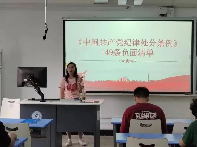 蔡玲为学生党员解读《中国共产党纪律处分条例》负面清单,帮助学生第一党支部的同志们更好地学习《中国共产党纪律处分条例》。课上,她引用警示教育典型案例为学生党支部开展党纪教育,以事实告诫青年学生党员“青春不能任性”。她号召青年学生党员学《条例》、守底线,做有理想、敢担当、能吃苦、肯奋斗的新时代好青年。