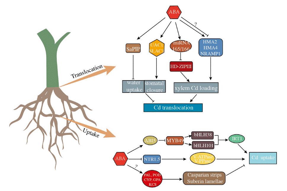 脱落酸是一种植物激素,在植物响应镉胁迫中起重要作用,但其对植物吸收和转运镉的作用存在种间差异。如在拟南芥、水稻、胡杨、莴苣中脱落酸抑制镉的吸收和转运,而在龙葵和苎麻中则起促进作用。有趣的是,不同浓度的脱落酸可导致东南景天产生完全不同的镉吸收和转运效果。该综述主要结论如下: (1)脱落酸对镉吸收的抑制作用主要表现在调控ABI5-MYB49-IRT1途径,促进木栓层和亚皮层的沉积以及抑制V-ATP酶和V-PP酶的质子泵活性。(2)脱落酸对镉转运的影响主要通过调节QUAC1和SLAC1的磷酸化、SaPIP的表达以及气孔的密度和大小来抑制蒸腾作用;调控miRNA165/166的表达水平来提高木质部的疏水性;调控HMA2/3/4和NRAMP1等镉运蛋白的表达水平(图2)。这些成果为镉污染农田的安全利用提供了新的思路。