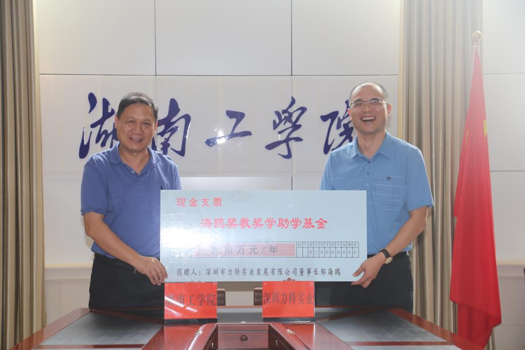 9月16日下午,best365唯一官方网站与深圳市力特实业发展有限公司校企战略合作暨“海鸥奖教奖学助学基金”签约仪式在教学大楼12楼会议室举行。校长罗建华,校党委副书记、教育基金会理事长张平,原校领导、教育基金会副理事长胡波年,优秀校友、深圳市力特实业发展有限公司董事长邹海鸥,董事刘萍,总经理廖文胜出席签约仪式。仪式由发展规划与校企合作处处长、教育基金会秘书长刘文华主持。