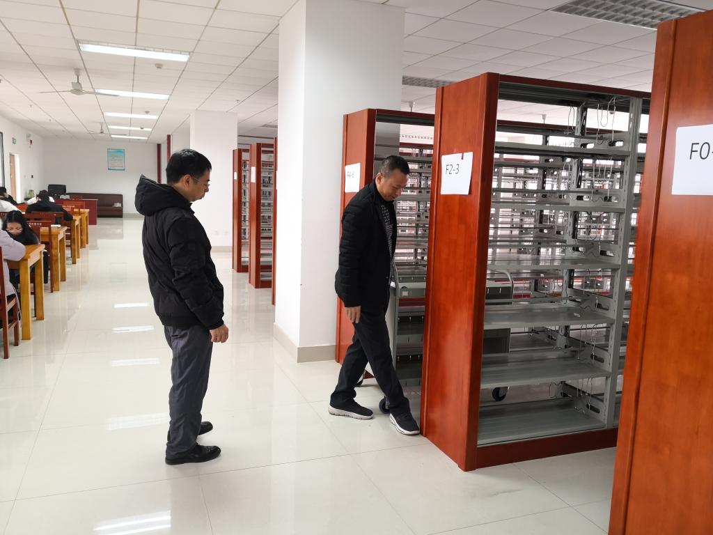 12月30日,发展规划与校企合作处处长刘文华、图书馆馆长宋楚华在图书馆3楼现场办公,推进“李冰阅览室”“开元股份阅览室”建设。