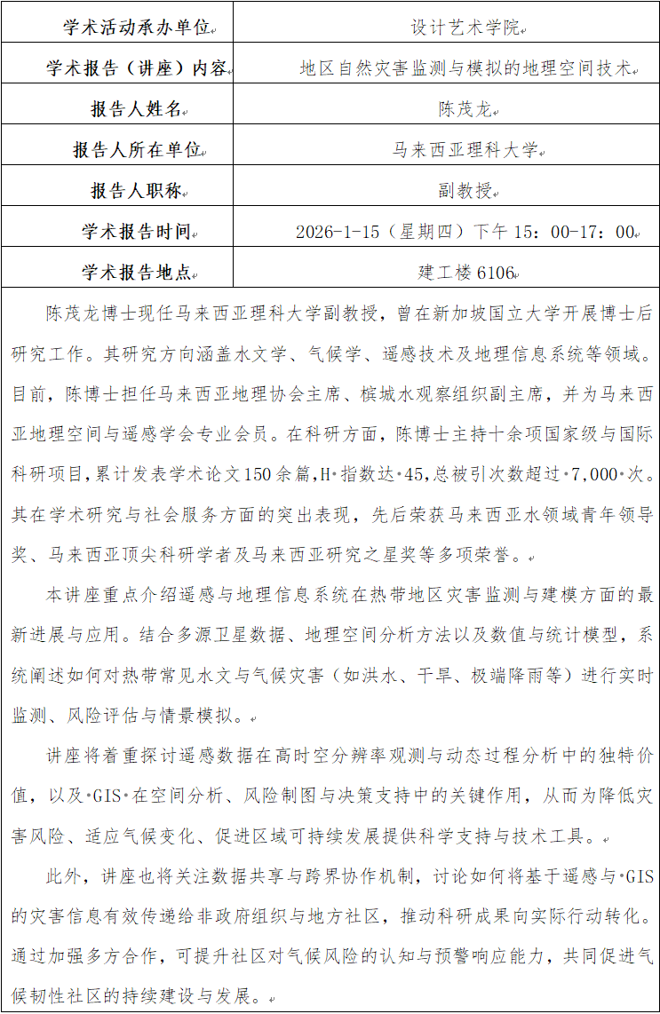 【讲座预告】地区自然灾害监测与模拟的地理空间技术