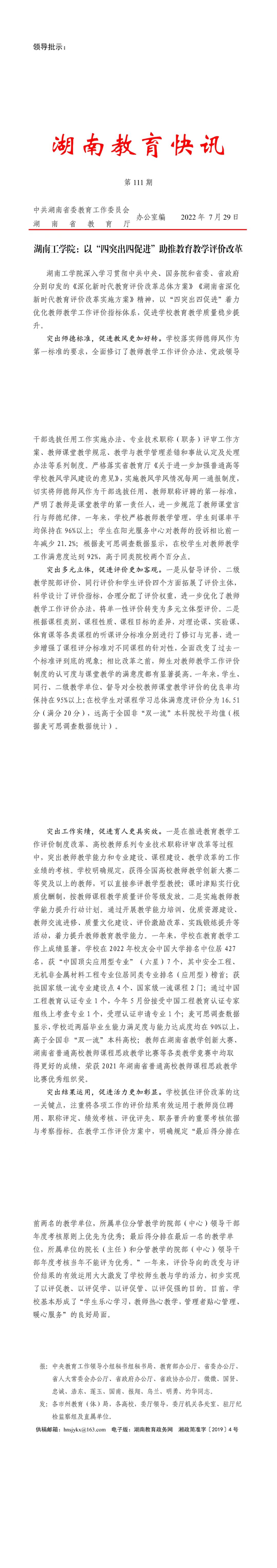 湖南教育快讯刊登介绍best365官网教育教学评价改革经验文章——best365唯一官方网站:以“四突出四促进”助推教育教学评价改革