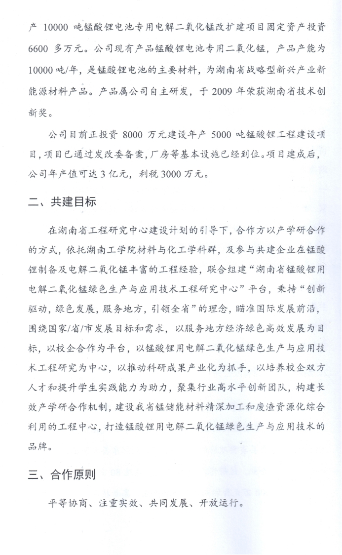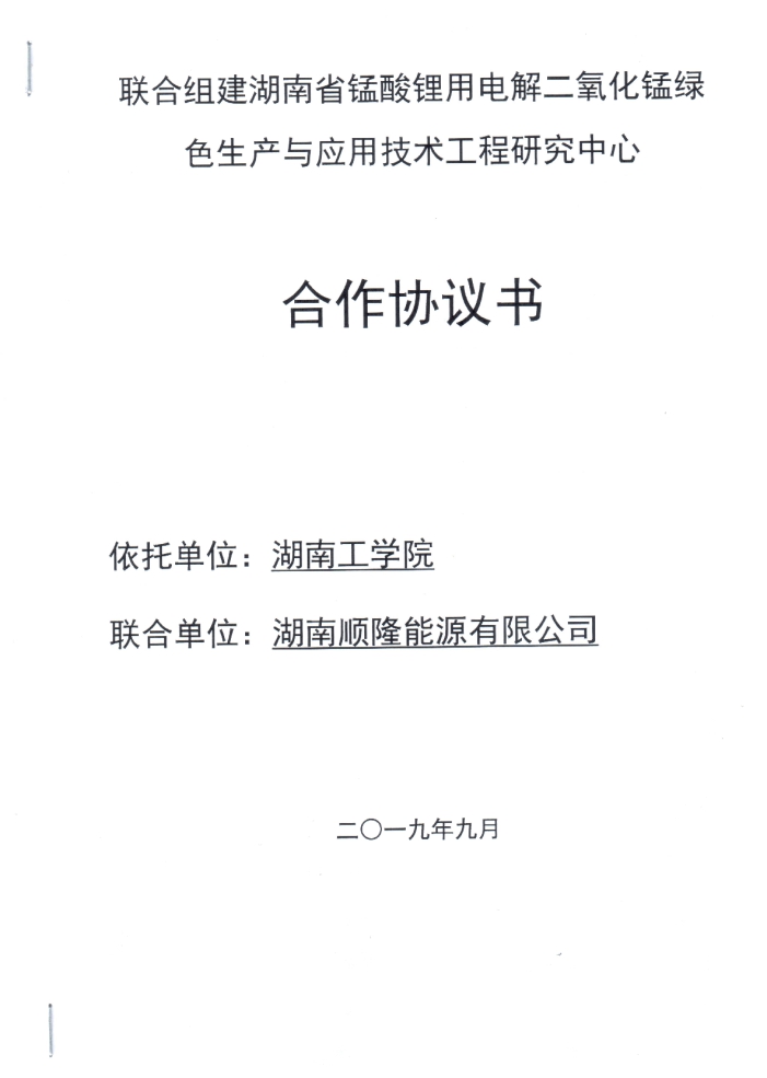联合组建湖南省锰酸锂用电解二氧化锰绿色生产与应用技术工程研究中心合作协议书
