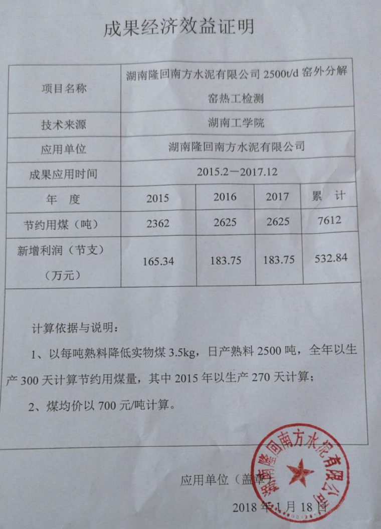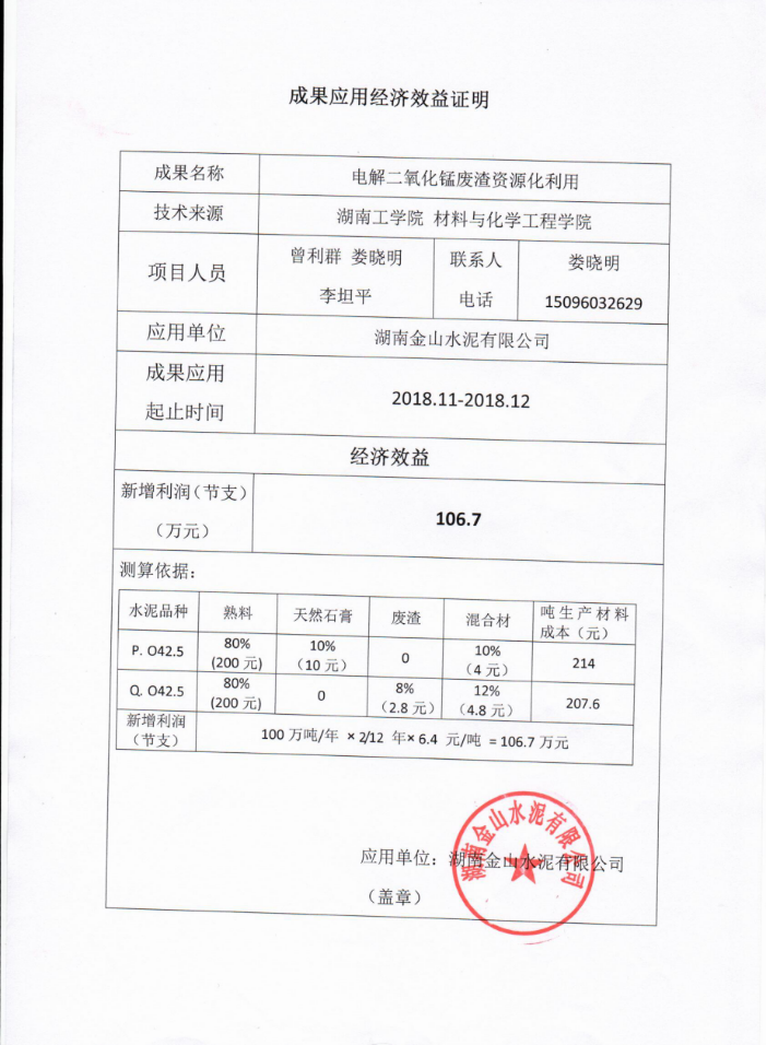 “电解二氧化锰废渣资源化利用”成果在湖南金山水泥有限公司产生的经济效益证明材料